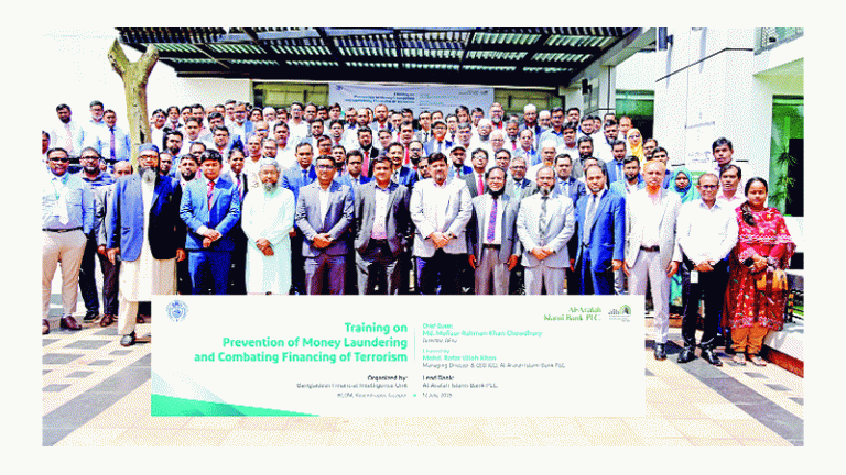 ‘মানিলন্ডারিং ও সন্ত্রাসে অর্থায়ন প্রতিরোধে’ সমতা বৃদ্ধির লক্ষে আল-আরাফাহ্ ইসলামী ব্যাংকের উদ্যোগে ও লিড ব্যাংক হিসেবে গাজীপুর ব্র্যাক সিডিএমে দিনব্যাপী প্রশিক্ষণ কর্মশালা ১৩ জুলাই অনুষ্ঠিত হয়েছে। বাংলাদেশ ফাইন্যান্সিয়াল ইন্টেলিজেন্স ইউনিটের (বিএফআইইউ) পরিচালক মো. মফিজুর রহমান খান চৌধুরী প্রধান অতিথি হিসেবে প্রশিক্ষণ কর্মশালার উদ্বোধন করেন। সভাপতিত্ব করেন আল-আরাফাহ্ ইসলামী ব্যাংকের ব্যবস্থাপনা পরিচালক (চলতি দায়িত্ব) মো. রাফাত উল্লা খান।