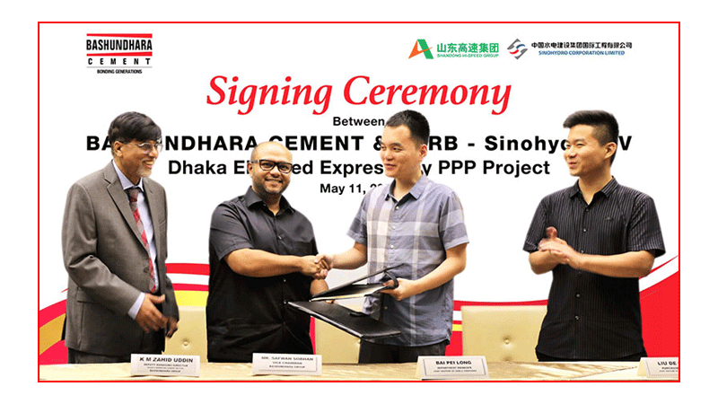 বসুন্ধরা সিমেন্ট, চীনের নির্মাণ প্রতিষ্ঠান শানডং হাইস্পিড গ্রুপ এবং শিনোহাইড্রো করপোরেশন লিমিটেডের জয়েন্ট ভেঞ্চার এসডিআরবি-শিনোহাইড্রো জেভির মধ্যে ঢাকা এলিভেটেড এক্সপ্রেসওয়ে পিপিপি প্রকল্প নির্মাণে এক্সক্লুসিভলি বসুন্ধরা সিমেন্ট সরবরাহ সংক্রান্ত চুক্তি স্বাক্ষরিত হয়েছে। বসুন্ধরা গ্রুপের ভাইস চেয়ারম্যান সাফওয়ান সোবহান এবং জয়েন্ট ভেঞ্চারের ডিপার্টমেন্ট ম্যানেজার বাই পেই লং একটি হোটেলে চুক্তিটি স্বাক্ষর করেন। উপস্থিত ছিলেন বসুন্ধরা গ্রুপের সিমেন্ট সেক্টরের ডিএমডি কেএম জাহিদ উদ্দিন এবং ওই জয়েন্ট ভেঞ্চারের ক্রয় ব্যবস্থাপক লিউ ডে কিয়াং।