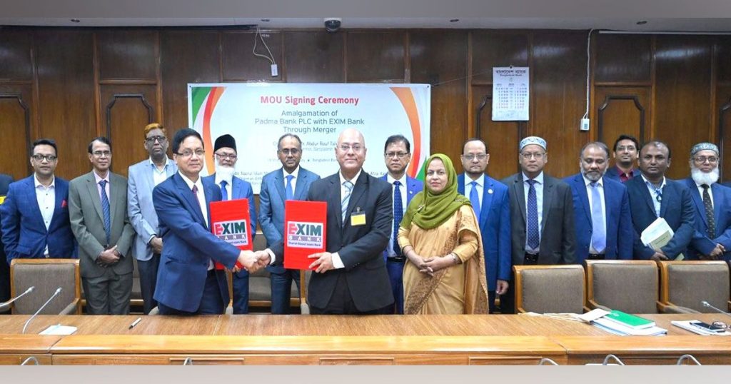 একীভূত করার লক্ষ্যে বেসরকারি খাতের পদ্মা ব্যাংক লিমিটেডের সঙ্গে সমঝোতা স্মারক (এমওইউ) স্বাক্ষর করেছে এক্সপোর্ট ইম্পোর্ট ব্যাংক অফ বাংলাদেশ (এক্সিম ব্যাংক) লিমিটেড।
