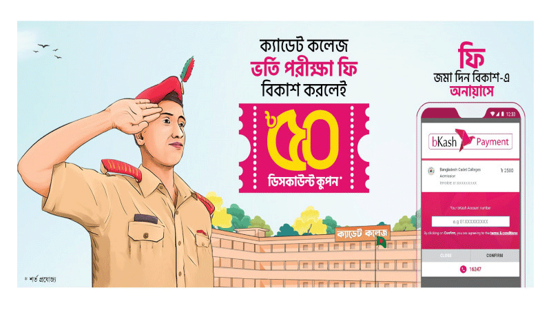 দেশে বর্তমানে ছেলেদের নয়টি এবং মেয়েদের তিনটিসহ মোট ১২টি ক্যাডেট কলেজ রয়েছে। এই কলেজসমূহে ভর্তি পরীার আবেদন ফি বিকাশে পেমেন্ট করে আবেদনকারীরা শর্তসাপেক্ষে তিন থেকে চার কার্যদিবসের মধ্যে পেতে পারেন ৫০ টাকার ডিসকাউন্ট কুপনটি। খবর বিজ্ঞপ্তির ●