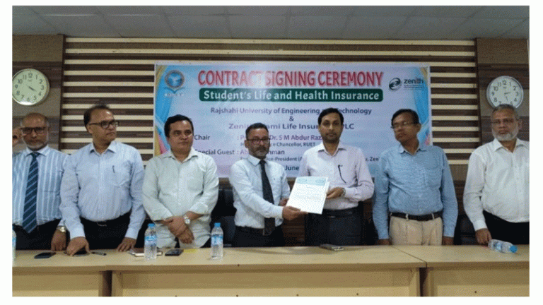 নিয়মিত শিার্থীদের স্বাস্থ্য ও জীবন বীমা সুবিধার আওতায় আনল রাজশাহী প্রকৌশল ও প্রযুক্তি বিশ্ববিদ্যালয় (রুয়েট)। বীমা কোম্পানি জেনিথ ইসলামী লাইফ ইন্স্যুরেন্স পিএলসির সাথে ২২ জুন যন্ত্রকৌশল বিভাগের সেমিনার রুমে এ সংক্রান্ত একটি চুক্তি স্বার করেছে বিশ্ববিদ্যালয় কর্তৃপ।