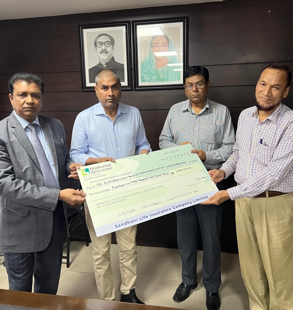 সন্ধানী লাইফ ইনস্যুরেন্স কোম্পানী লিমিটেড এর বীমা গ্রাহক মো. আলাউদ্দিনের মেয়াদোত্তর দাবীর ১৪,৫০,০৬৭ টাকার চেক কোম্পানীর প্রধান কার্যালয়ে সম্প্রতি বীমা গ্রাহকের নিকট হস্তান্তর করেন কোম্পানীর চেয়ারম্যান মুজিবুল ইসলাম।